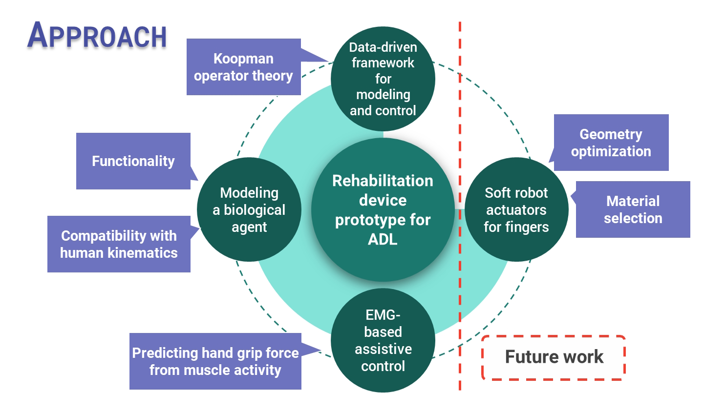 Stroke is one of the world’s increasing problems, often leaving a person permanently disabled and unable to perform activities of daily living. Robotic devices are increasingly being imposed as a solution for timely and optimal rehabilitation of such patients, which, along with advanced control and measuring technologies, enable adaptive therapy and monitoring of parameters in real-time. Devices that are safe and comfortable to wear can be developed by combining the benefits of traditional and soft robotics with appropriate sensor technologies. Those systems can also enable the measurement of muscle activation as an input for adapting the amount of the generated force by an actuator. Such actuators should assure the necessary force in the rehabilitation process so the patients can perform specific movements. The proposed research represents an important segment of this chain, and contains two important directions. The first direction refers to the research and analysis of materials for developing soft robots using numerical methods based on the finite element method. Such research should result in the selection of materials with suitable mechanical properties in order to achieve the necessary functionality and durability of the component. Another important direction is the continuation of the development of a module for detecting the activation of muscle fibers of the human forearm, using machine learning and artificial intelligence methods. Namely, within the framework of the UNIRI-INOVA project whose outcomes were highly rated, significant results were accomplished and the necessary module for electromyographic (EMG) sensor signal processing was developed to achieve a high correlation with the dynamometer signal. One of the aims of this project proposal, is an extension of the functionality that allows real-time modeling and prediction of imposed force, in a very short period of time using only the EMG signal. Such a module, which would be tested experimentally among the members of the research team, should in future be a key component in the bio-mechanical interaction between a person and a rehabilitation robot. For such comprehensive research, the collaborators on the project have already applied for a competitive EU funded project.